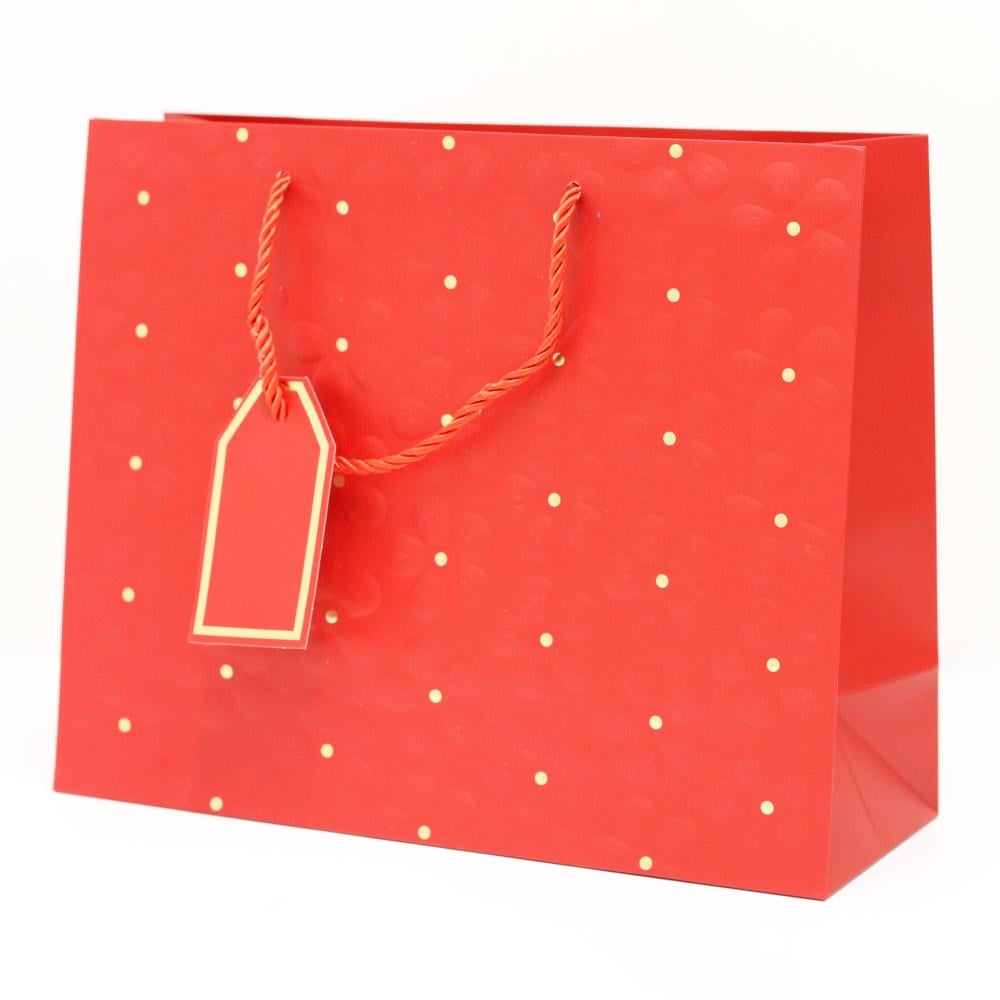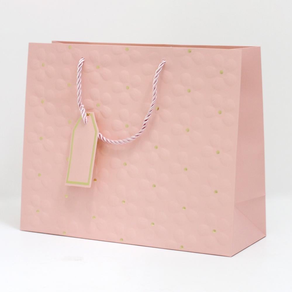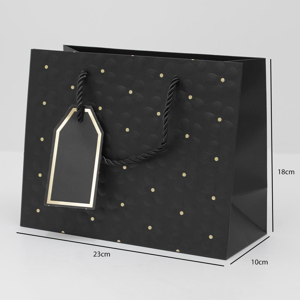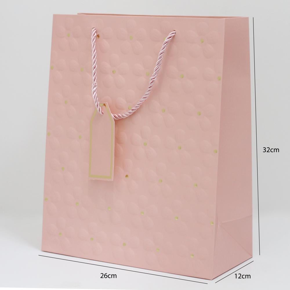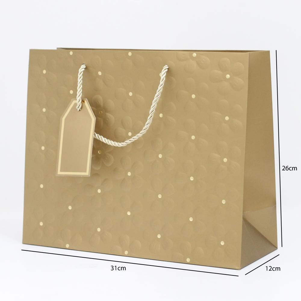 أكياس هدايا مزخرفة بتصميم فاخر بنقشة ورد بارزة ونقاط ذهبية تضيف لمسة من الرقي والفخامة لكل مناسبة. مصنوعة من ورق سميك عالي الجودة بملمس فاخر ومزودة بمقبض حبل قوي لسهولة الحمل، مع بطاقة إهداء أنيقة بنفس اللمسة الذهبية.