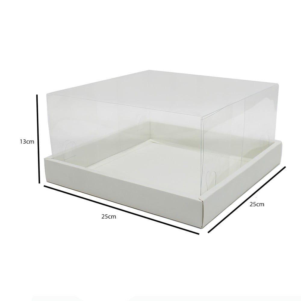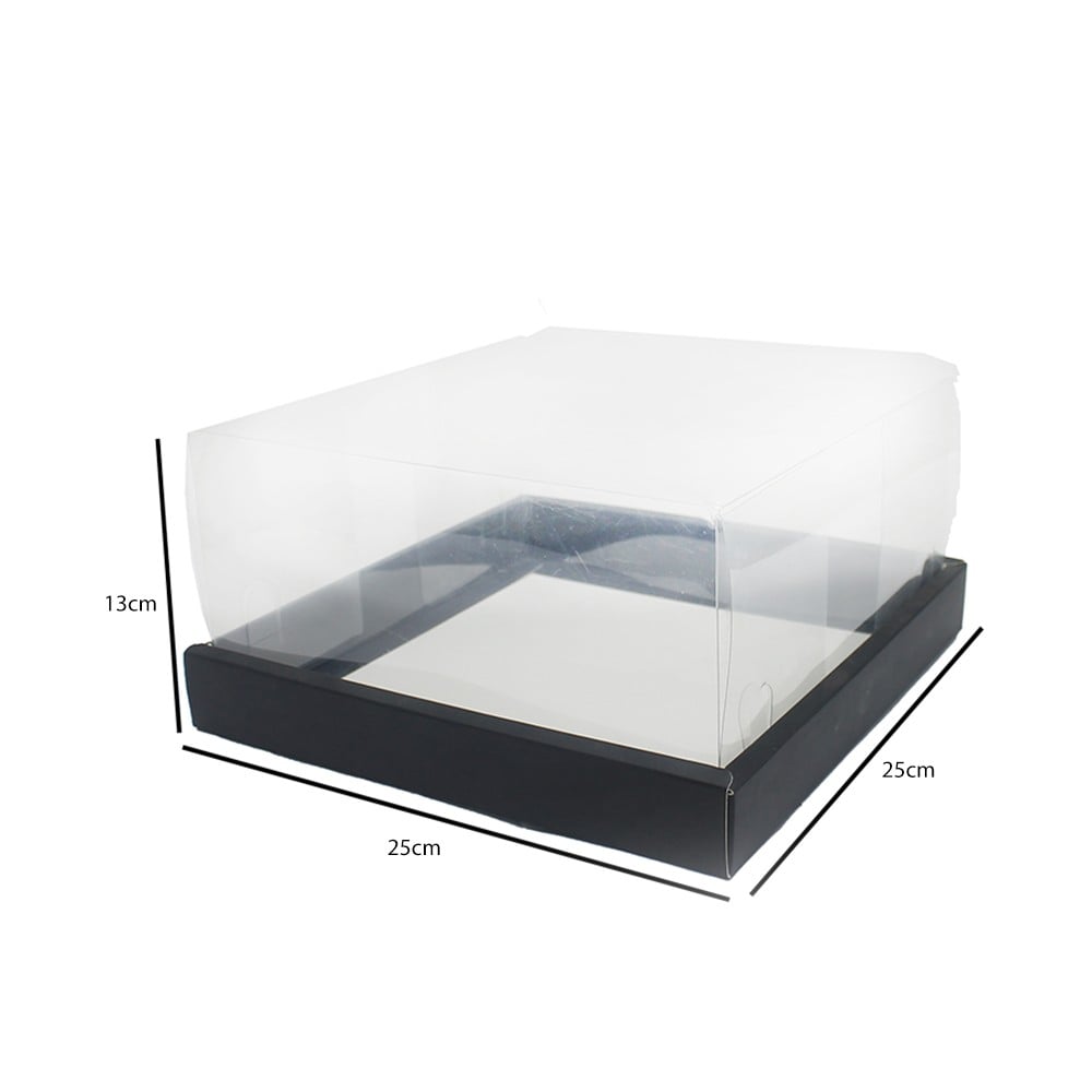 بوكس كيك عملي مصنوع من بلاستيك شفاف مع قاعدة ورقية متينة، مصمم ليبرز شكل الكيك والحلويات بشكل احترافي.