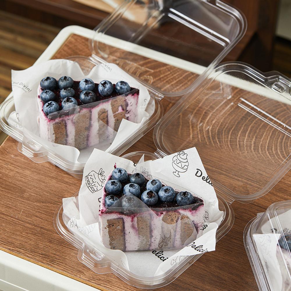 علبة بلاستيك شفافة مصممة خصيصًا لتعبئة وتقديم قطع الكيك الفردية بشكل أنيق وجذاب، مثالية للمخابز والمقاهي وتغليف الحلويات الجاهزة.