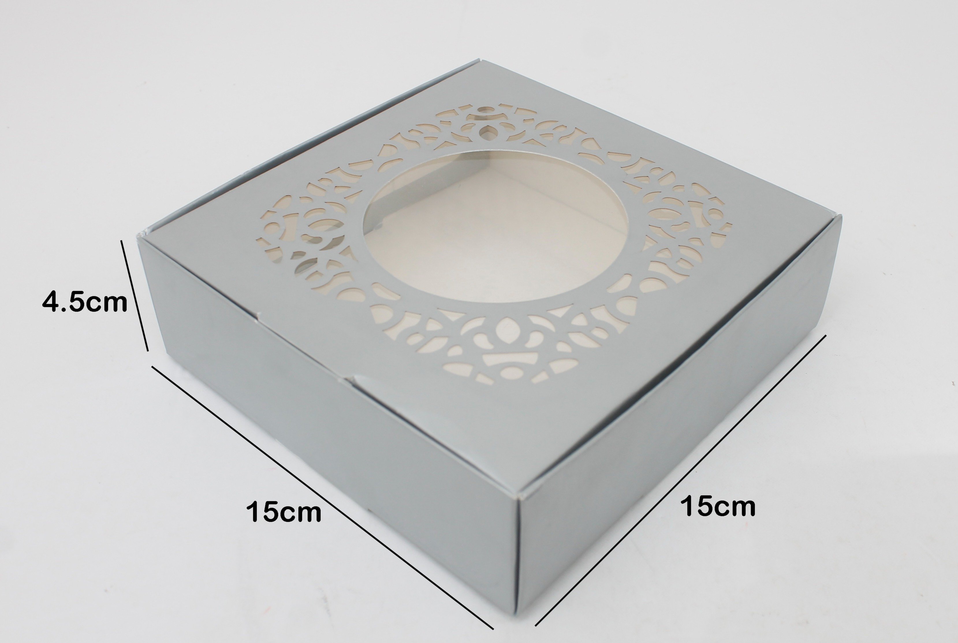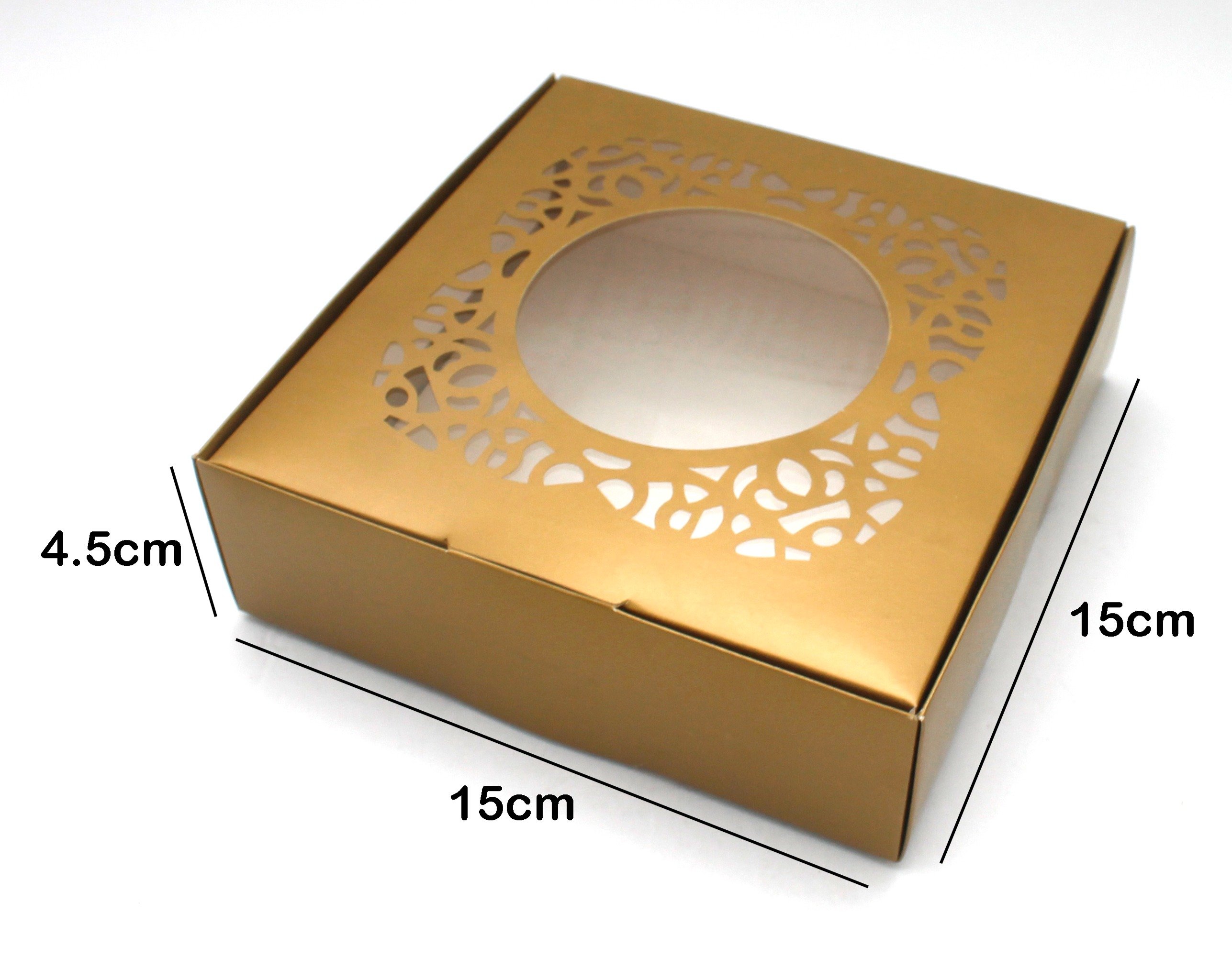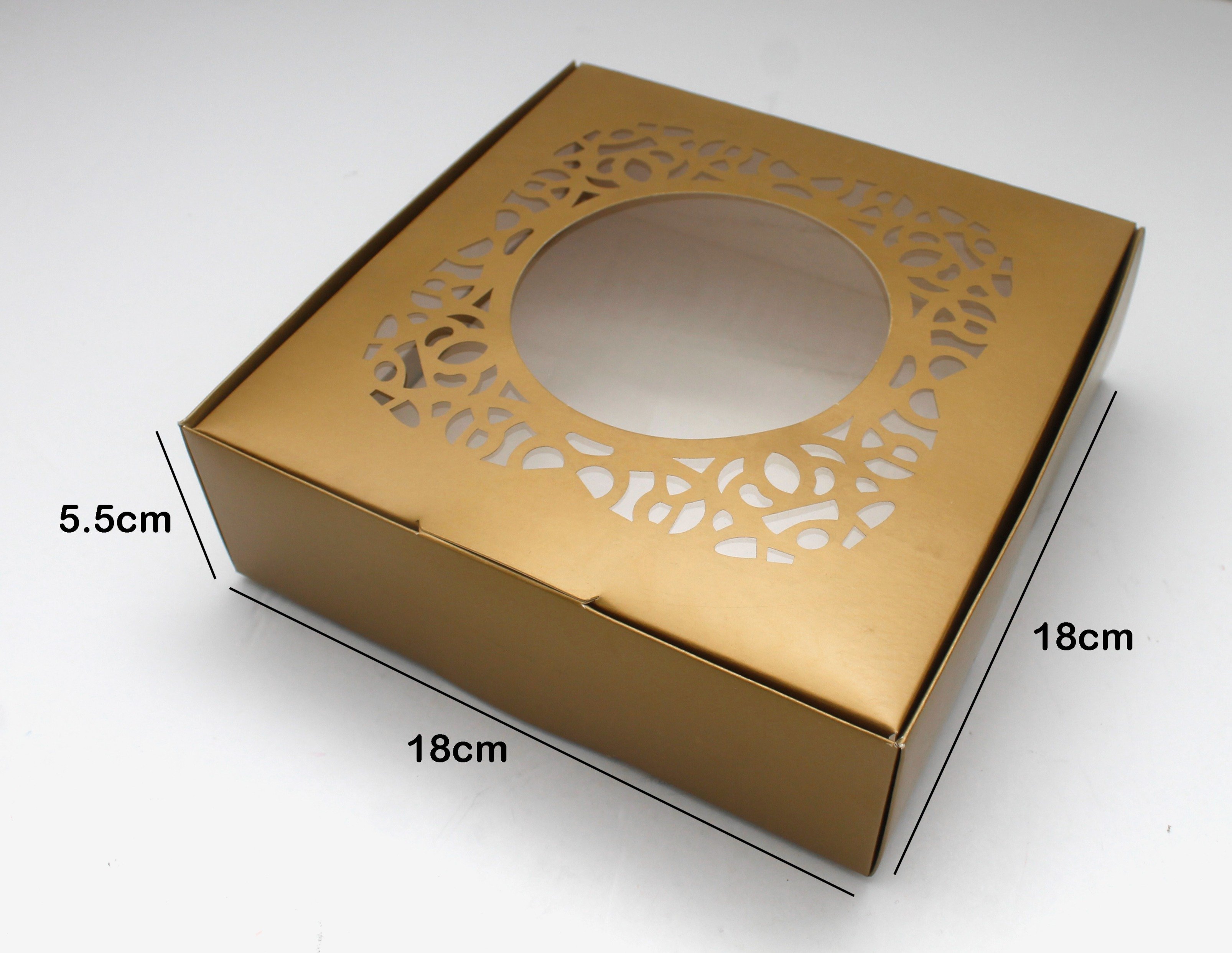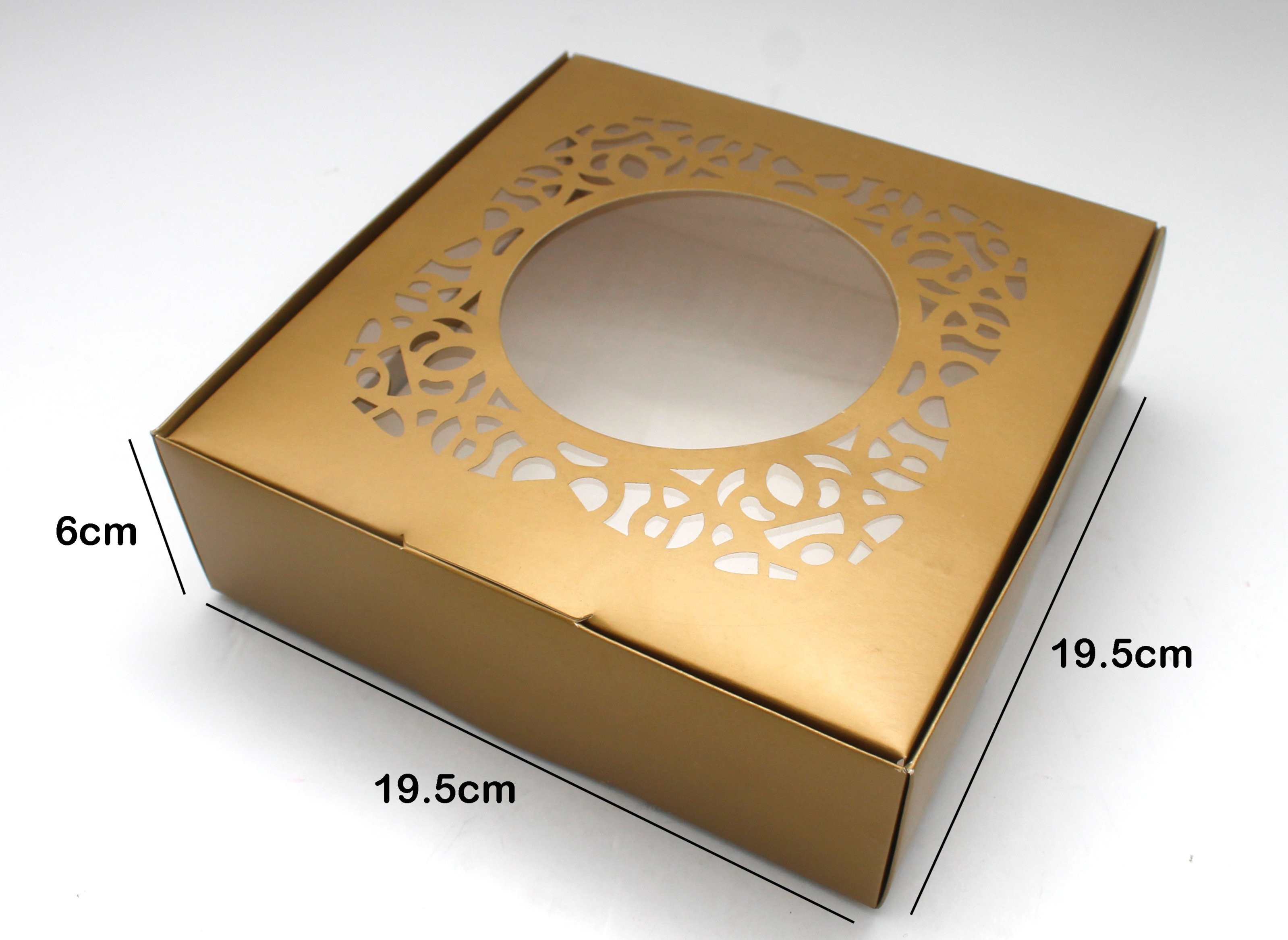 - تصميم مزخرف جذاب مع نافذة أمامية مميزة تبرز تفاصيل الحلويات أو الهدايا الموضوعة داخل العلبة.