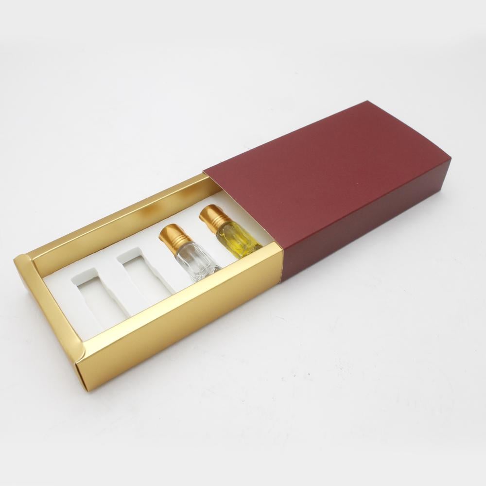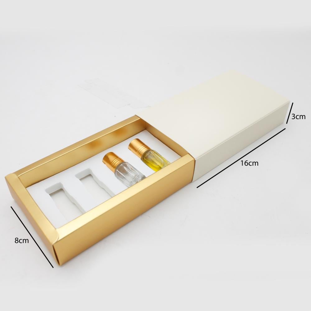 علبة أنيقة مصممة لحفظ 4 تولات من العطور، مصنوعة من الورق المقوى الفاخر مع لمسة ذهبية جذابة وغطاء منزلق للحماية والتخزين الآمن. تتميز بتقسيم داخلي دقيق يحافظ على الزجاجات في مكانها ويمنع انسكابها، مما يجعلها مثالية للإهداء أو التخزين الفاخر.