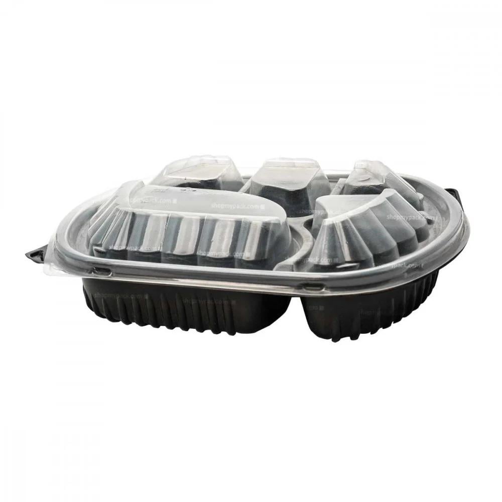 كرتون علب طعام بلاستيك مستطيلة للميكرويف لون أسود وغطاء شفاف مقسم 5 أقسام بجودة عالية.