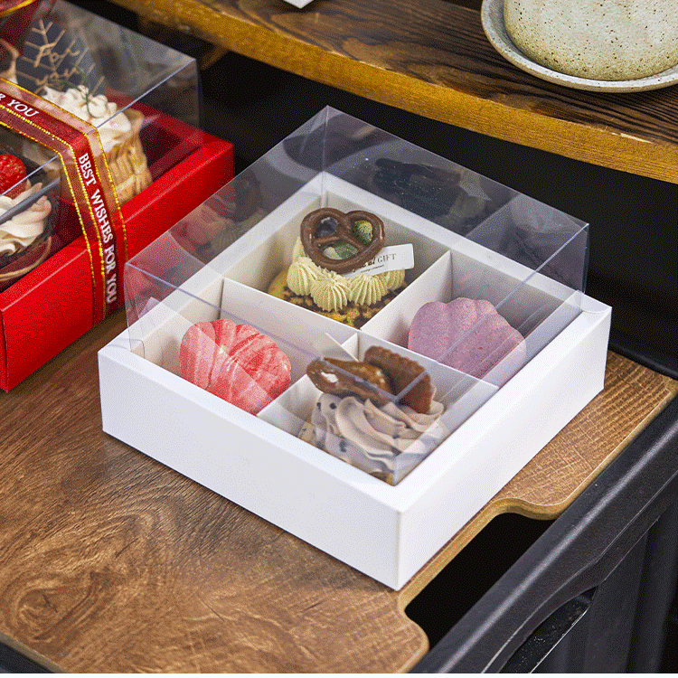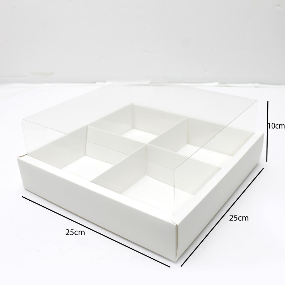 علبة تغليف أنيقة مصنوعة من الورق المقوى المتين مع غطاء بلاستيكي شفاف، مثالية لتقديم الحلويات والهدايا بطريقة جذابة. تتميز بتقسيم داخلي إلى 4 أقسام مما يجعلها مثالية لتنسيق الحلويات أو المعجنات بشكل مرتب وأنيق. تصميمها العصري يحافظ على المنتج طازجًا ويمنحه مظهرًا راقيًا عند التقديم أو الإهداء.