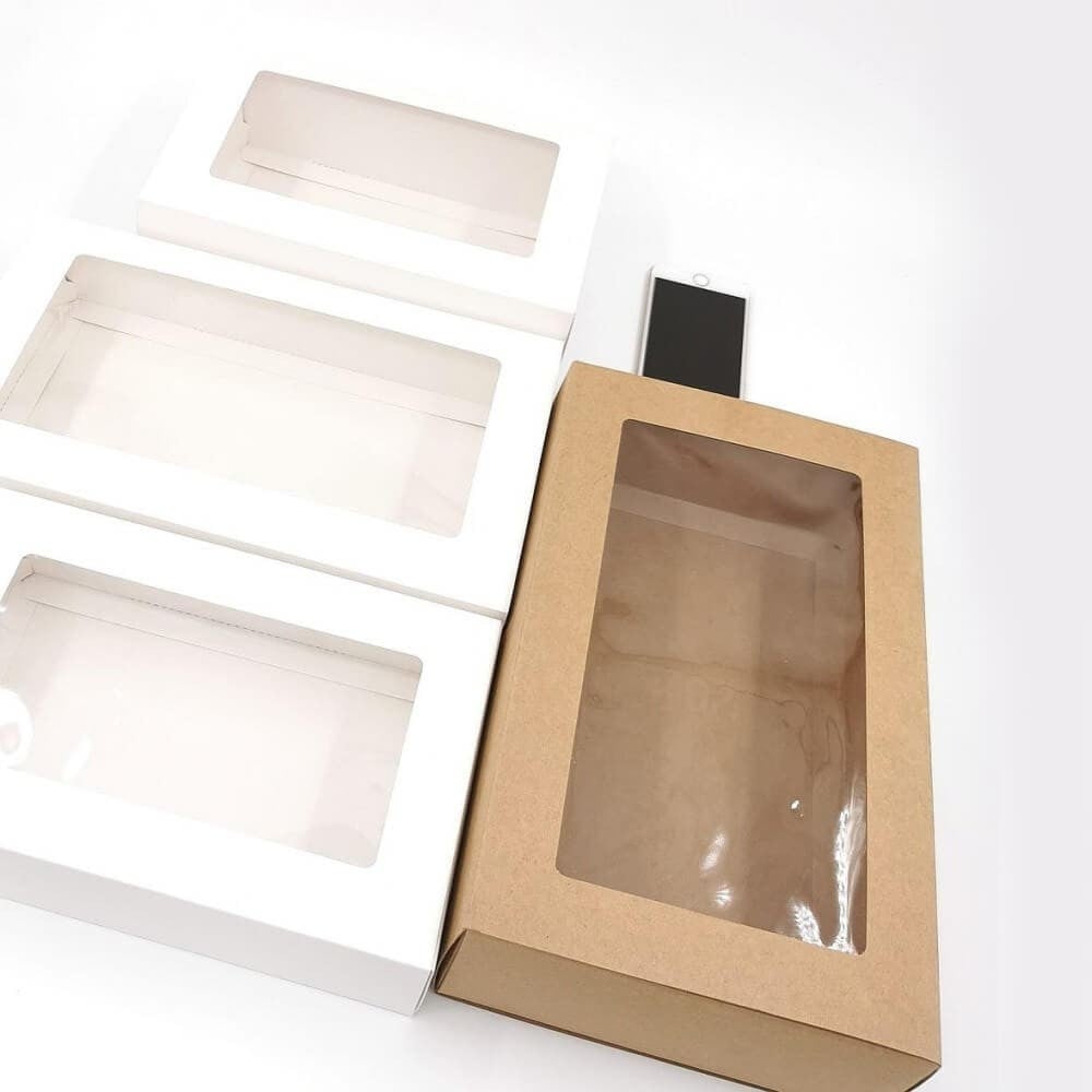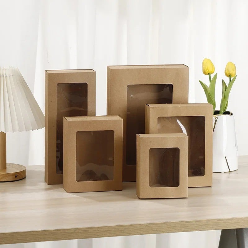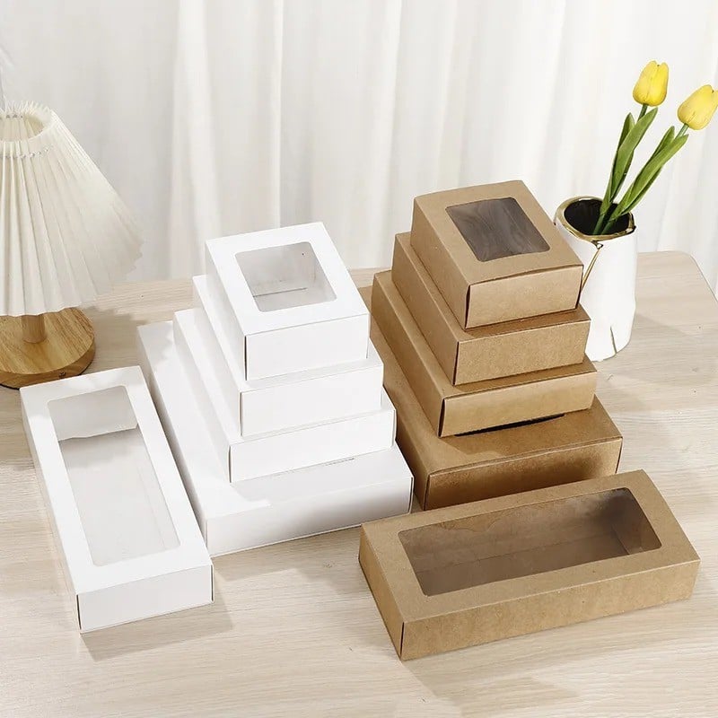 مجموعة من الصناديق الورقية الأنيقة والمثالية لتغليف الهدايا أو المنتجات. مصنوعة من ورق عالي الجودة وخفيف الوزن، مع نافذة شفافة تُظهر محتويات الصندوق بطريقة جذابة ومميزة.