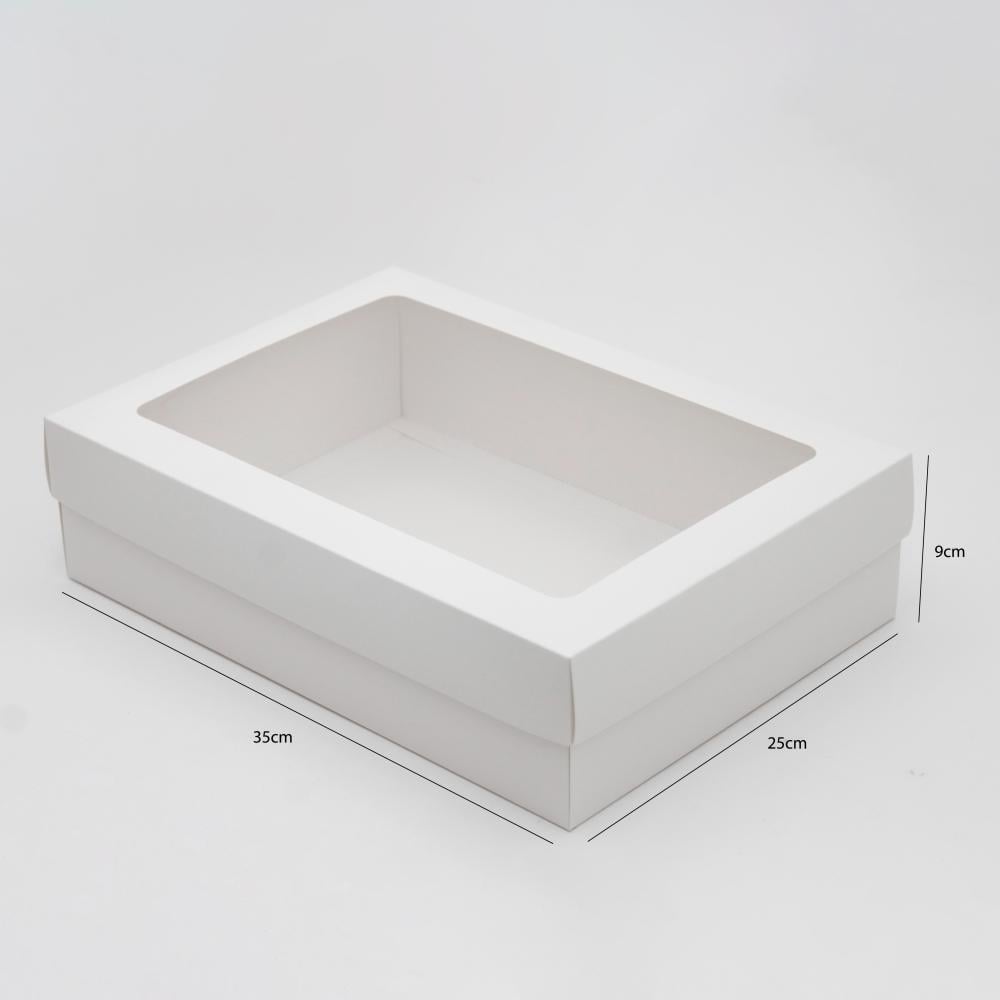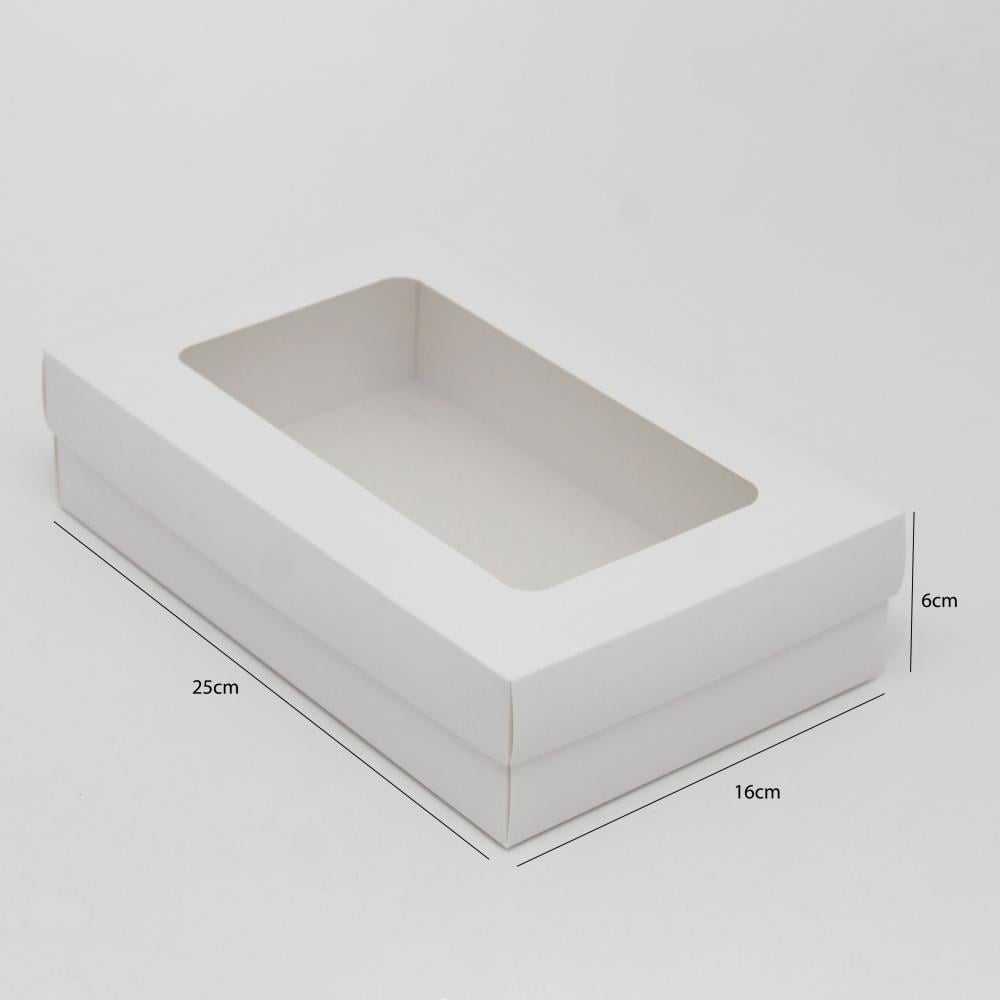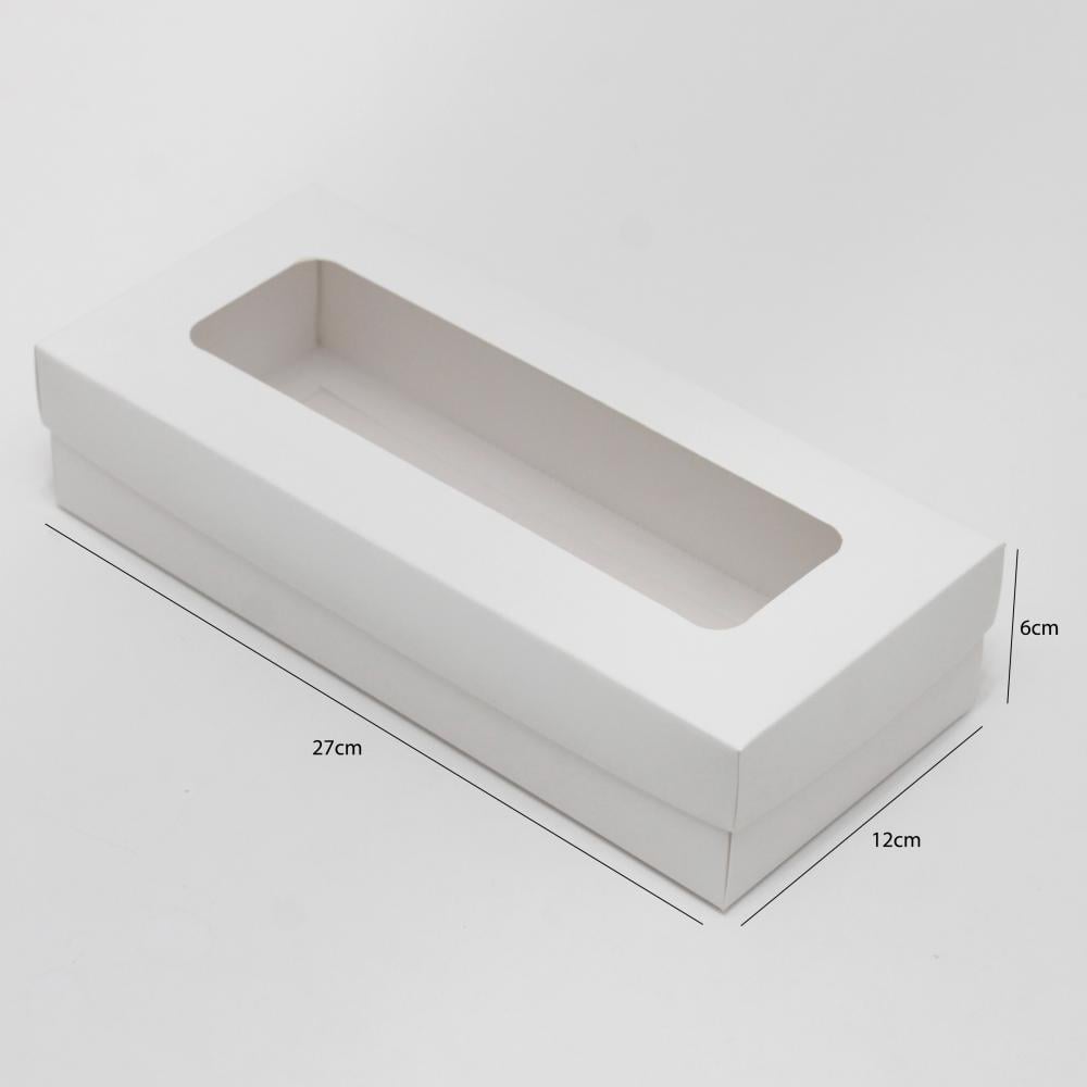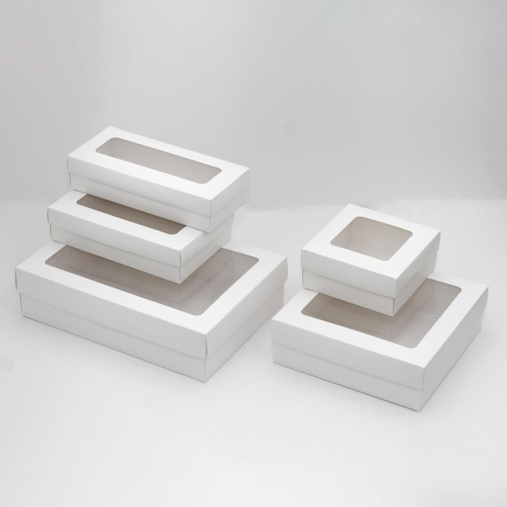 أضف لمسة عملية وأنيقة على تغليف منتجاتك مع هذه العلب الورقية البيضاء المزودة بغطاء منفصل ونافذة شفافة لعرض المحتوى بوضوح. مثالية لتغليف الهدايا، الحلويات، الإكسسوارات، أو التوزيعات، حيث تمنح منتجاتك مظهراً احترافياً وجذاباً.
